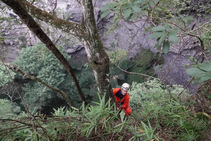 A cave expedition member stands among trees at the bottom of Nongyang Tiankeng (an area of naturally formed pits) in Napo County, south China's Guangxi Zhuang Autonomous Region, Nov. 2, 2019.