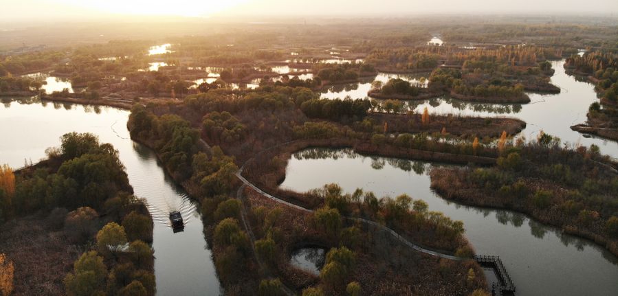 Aerial photo taken on Nov. 18, 2019 shows a view of the Jixi national wetland, located in western Jinan, east China's Shandong Province.(Xinhua/Wang Kai)