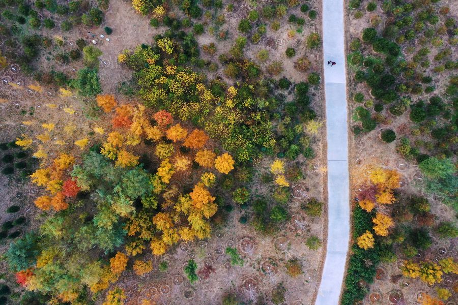 Aerial photo taken on Nov. 6, 2019 shows the autumn scenery of forest in Xiongan New Area, north China's Hebei Province. (Xinhua/Xing Guangli)