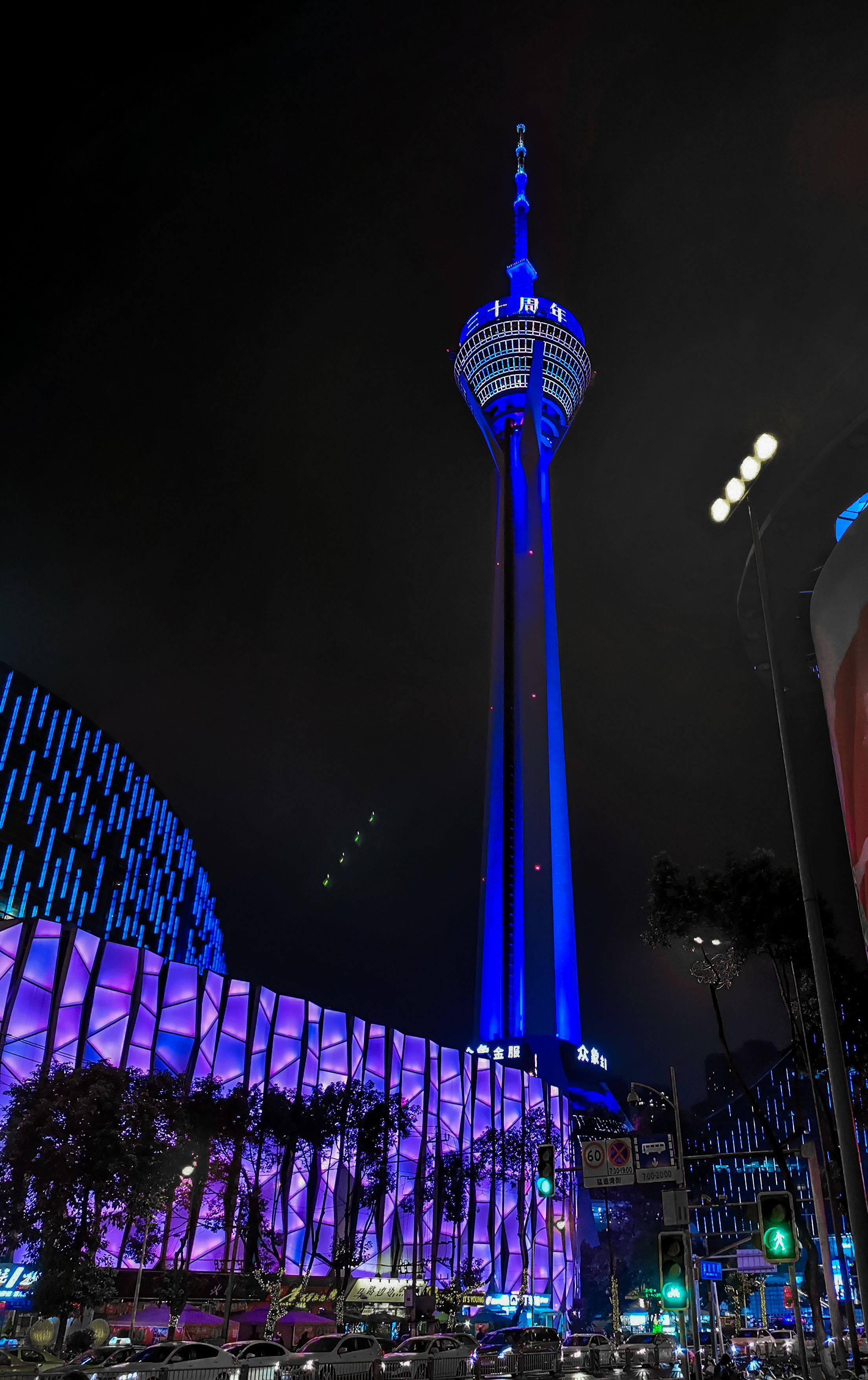 The Panda Tower exhibits blue lighting to mark World Children's Day 2019 in Chengdu, southwest China's Sichuan Province, Nov. 20, 2019. (Xinhua)
