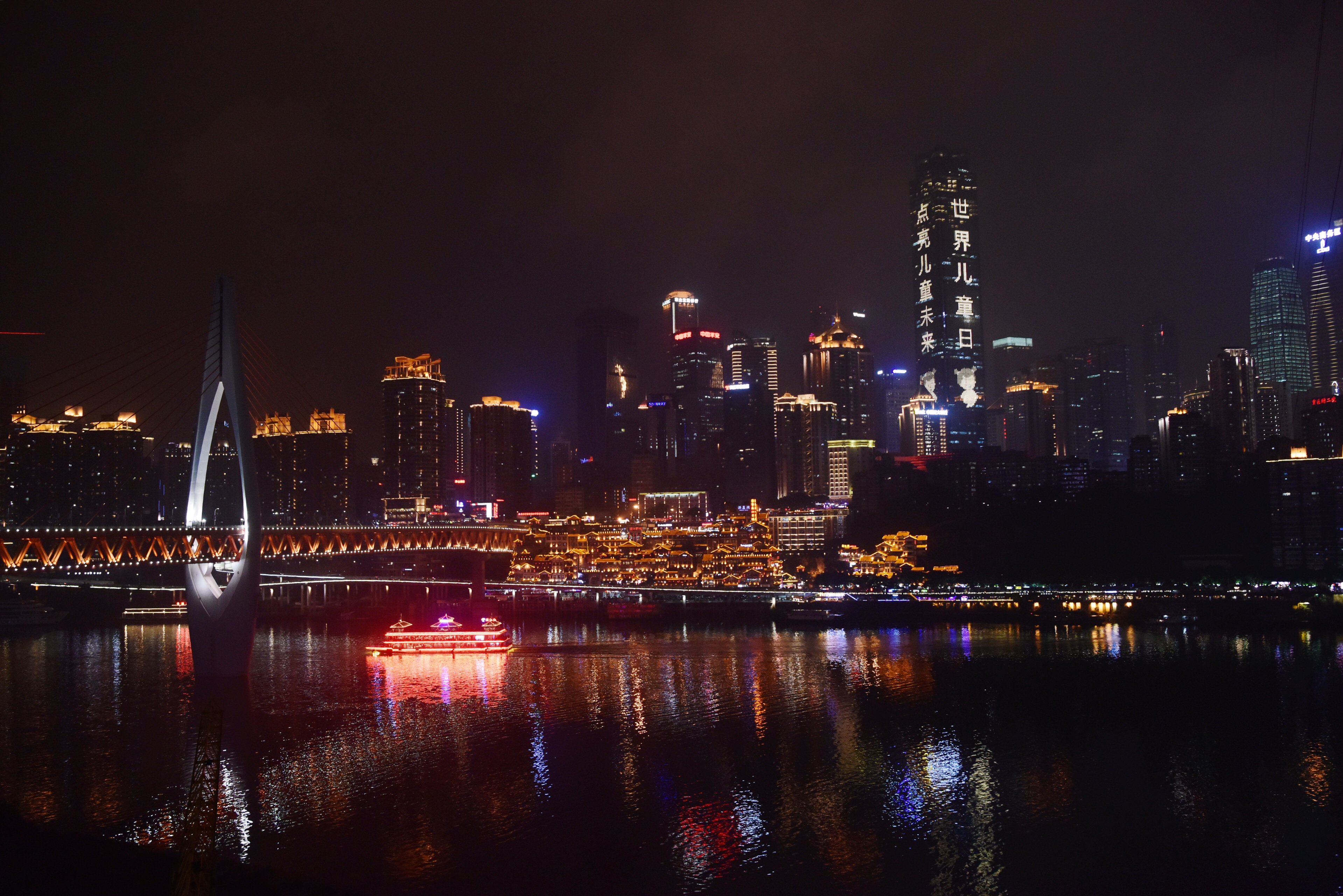 The Chongqing World Financial Center (the tallest building visible) exhibits special lighting to mark World Children's Day 2019 in southwest China's Chongqing, Nov. 20, 2019. (Xinhua/Wang Quanchao)