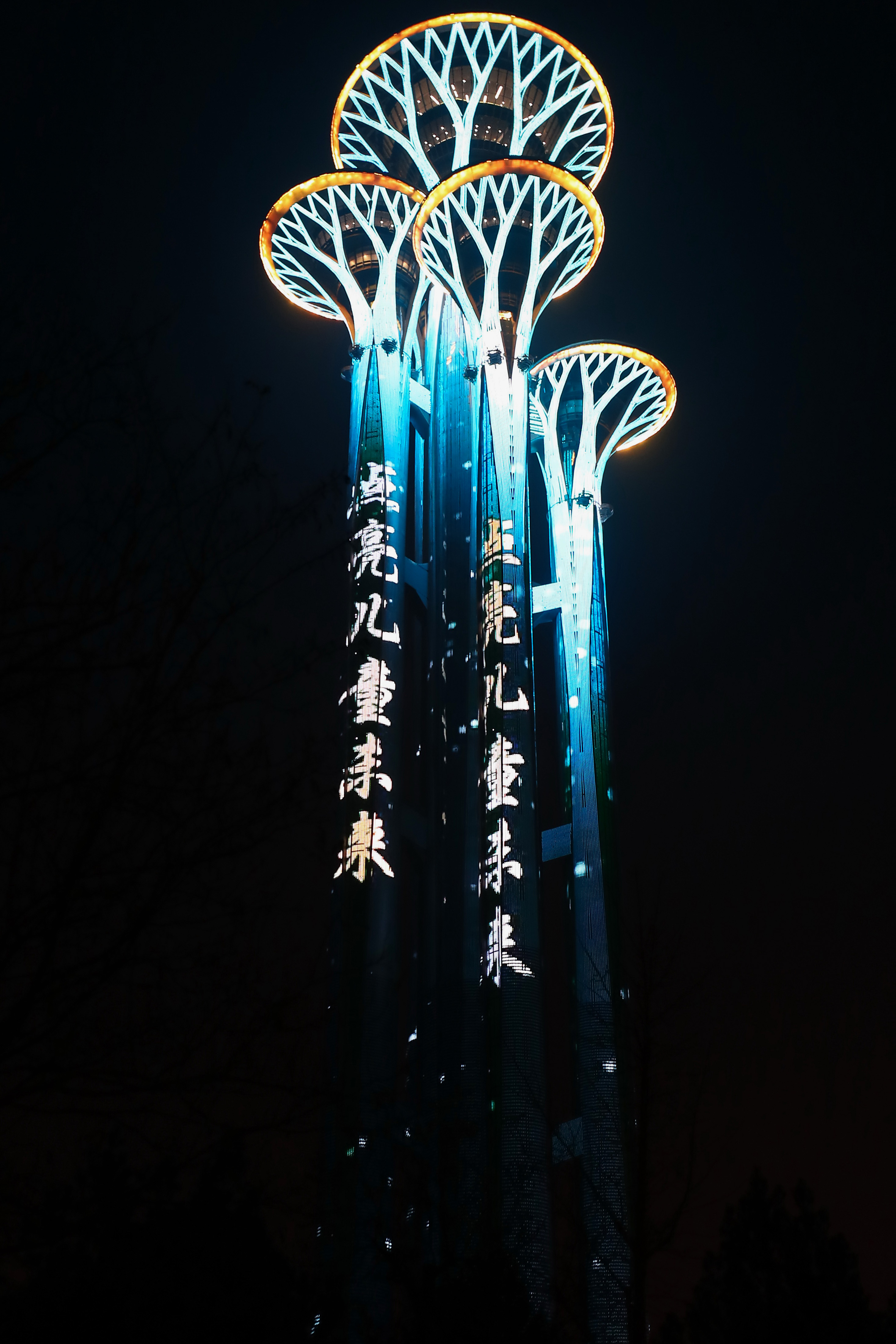 The Olympic Towers exhibit blue lighting to mark World Children's Day 2019 at the Olympic Park in Beijing, capital of China, Nov. 20, 2019. (Xinhua/Zhang Yuwei)