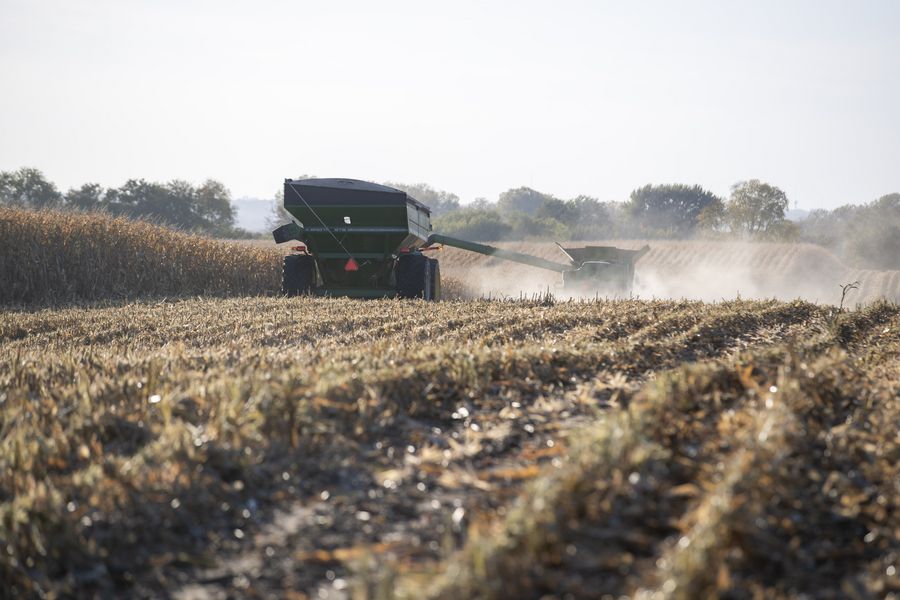 Agricultural machinery works in a field of Grant Kimberley's family farm in Maxwell, the U.S. state of Iowa, Oct. 17, 2019. (Xinhua/Wang Ying)