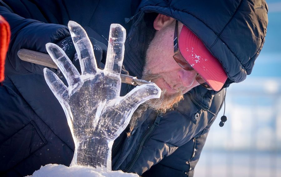 A sculptor takes part in the 9th China Harbin International Ice-Assemblage Championship in Harbin, northeast China's Heilongjiang Province, Jan. 3, 2020. (Xinhua/Wang Song)■