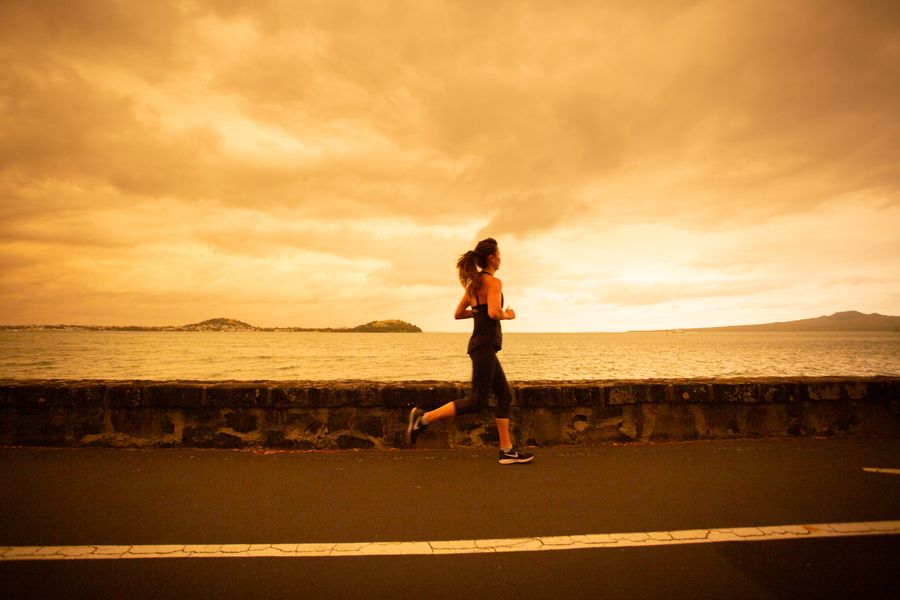 A woman jogs under an orange-colored sky as smoke generated by Australian bushfires hit Auckland, New Zealand, Jan. 5, 2020. (Photo by Li Qiaoqiao/Xinhua)