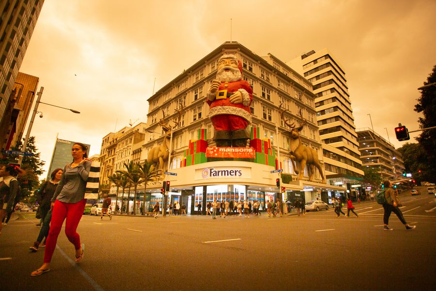 Queen Street, a main commercial thoroughfare, is pictured against an orange-colored sky as smoke generated by Australian bushfires hit Auckland, New Zealand, Jan. 5, 2020. (Photo by Li Qiaoqiao/Xinhua)