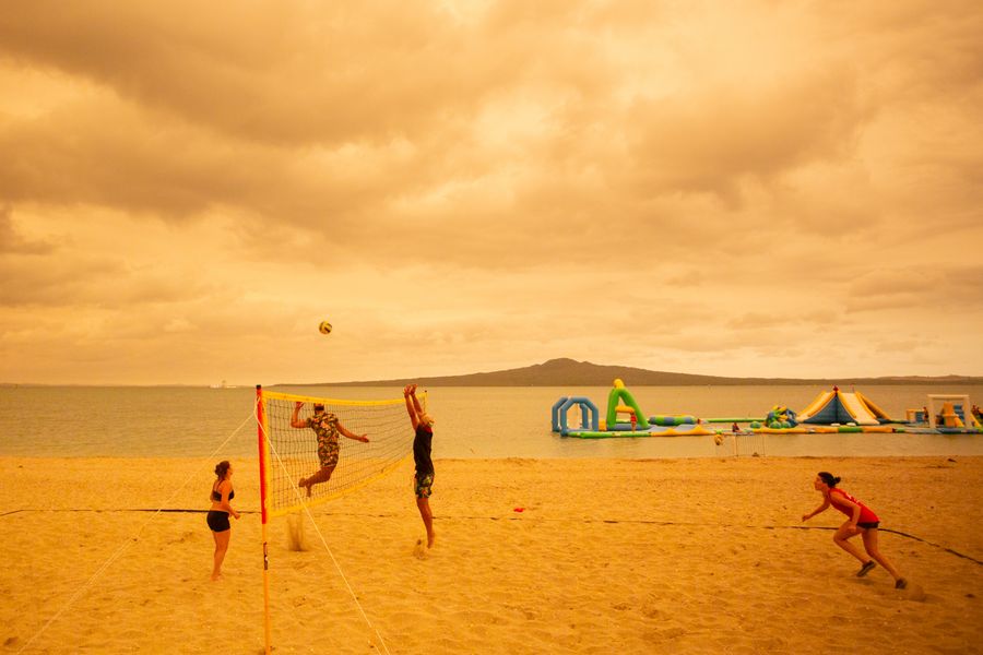 People play beach volleyball at the Mission Bay under an orange-colored sky as smoke generated by Australian bushfires hit Auckland, New Zealand, Jan. 5, 2020. (Photo by Li Qiaoqiao/Xinhua)