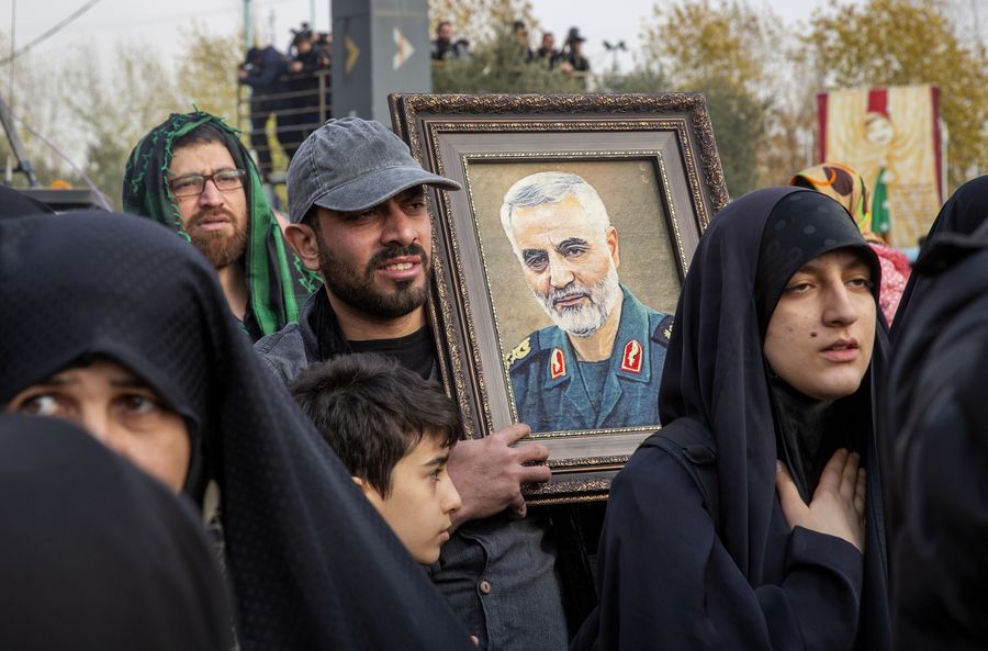 A man holds a picture of top Iranian commander Qassem Soleimani during a protest in Tehran, Iran, on Jan. 3, 2020. (Xinhua/Ahmad Halabisaz)
