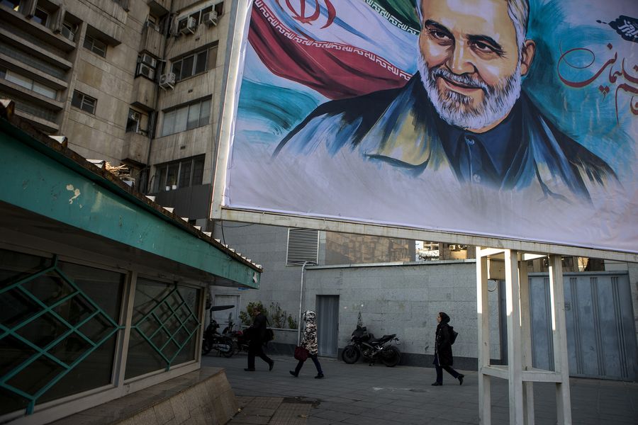 People walk past a poster of senior Iranian commander Qasem Soleimani in downtown Tehran, Iran, on Jan. 5, 2020. The latest confrontation between Tehran and Washington on Jan. 3, which led to the killing of Qassem Soleimani, commander of the Quds Force of Iran's Islamic Revolution Guards Corps (IRGC), has nurtured a risk that could lead to a war. (Photo by Ahmad Halabisaz/Xinhua)