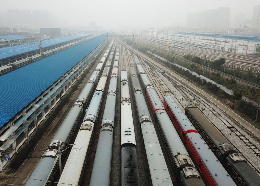 Trains are waiting for maintenance in Changsha, central China's Hunan Province.(Photo by Chen Zhenhai/Xinhua)