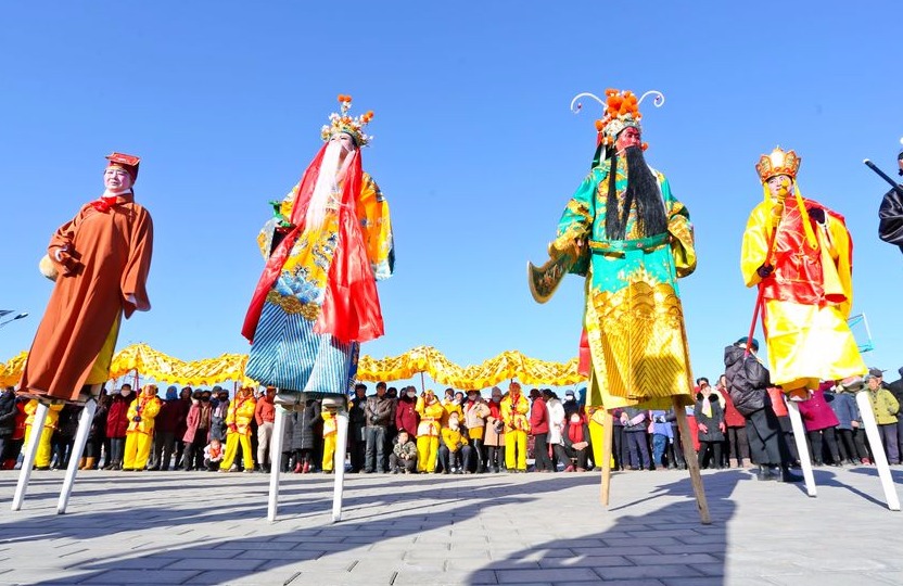 ZHANGYE, Jan. 14, 2020 (Xinhua) --"Shehuo" performance is a time-honored festivity during the celebration of the Chinese Spring Festival. The performance has multiple forms such as dragon dance, stilt walking, yangge dance, lion dance and other folk shows.