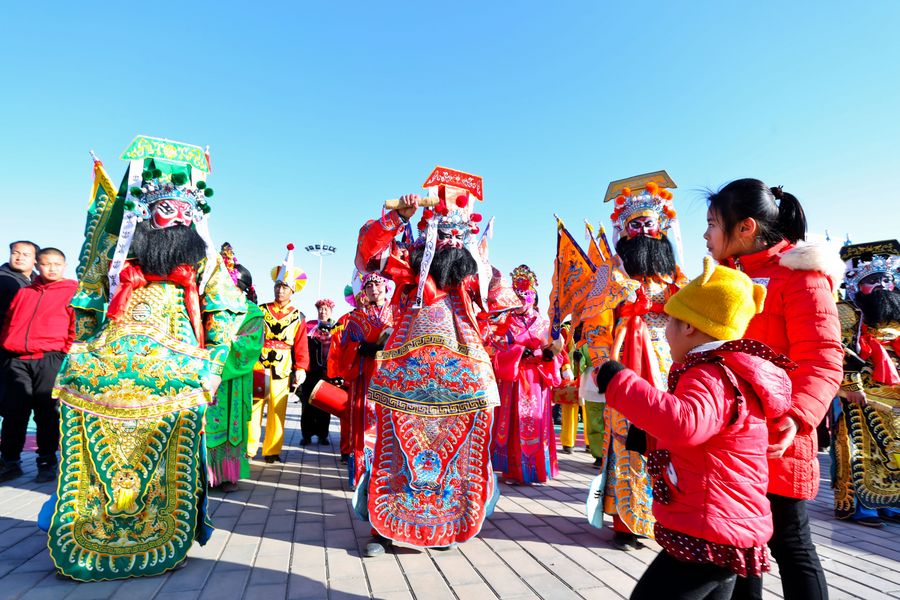 Members of a "Shehuo" performance team rehearse for the upcoming Chinese Spring Festival on a square in Jing'an Town of Zhangye City, northwest China's Gansu Province, Jan. 13, 2020.(Photo by Wang Jiang/Xinhua)