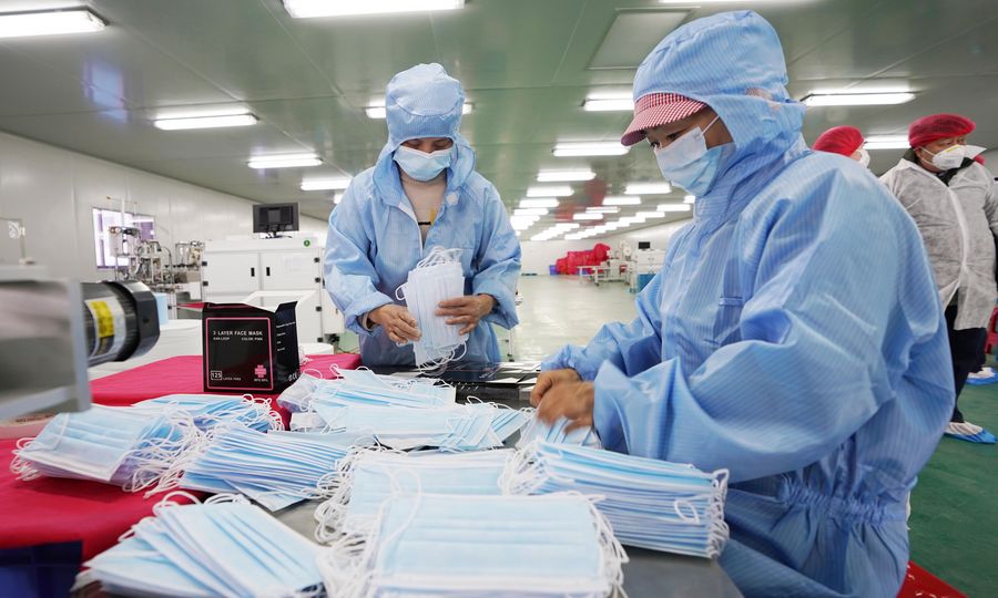 Workers make face masks at the workshop of a company in Wuhan, central China's Hubei Province, Jan. 28, 2020. To help fight the outbreak of pneumonia caused by novel coronavirus, workers of local medical material companies in Hubei Province rushed back to work to make protective masks, clothing and other protective equipment to guarantee the supplies. (Xinhua/Cai Yang)