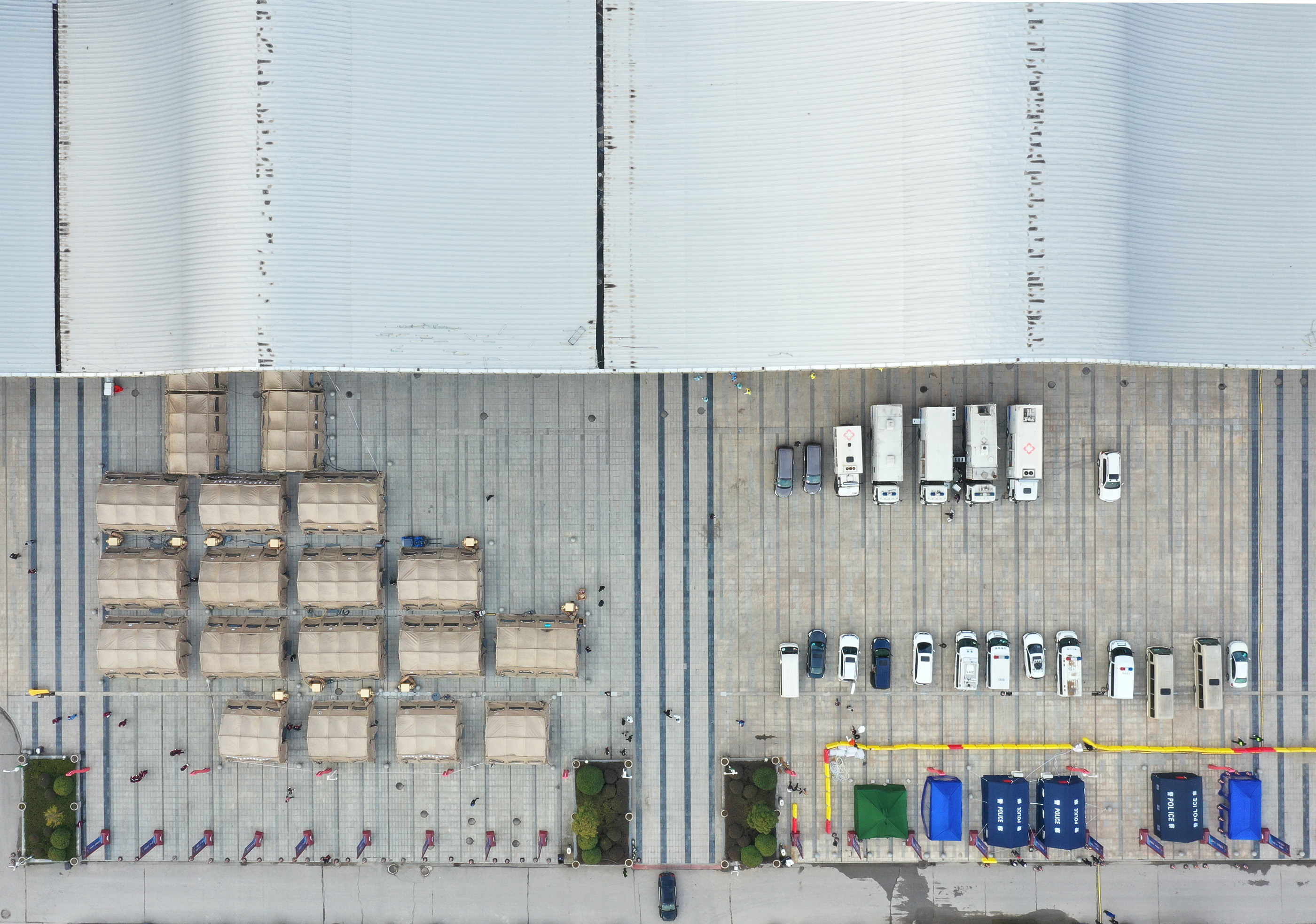 Makeshift sheds for staff members and vehicles at an exit of the "Wuhan Livingroom" in Wuhan, central China's Hubei Province, Feb. 8, 2020. The cultural building complex dubbed "Wuhan Livingroom," which is converted into a hospital to receive patients infected with the novel coronavirus, is designed to accommodate 2,000 beds. (Xinhua/Li He)