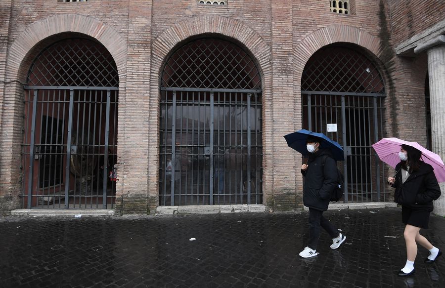 People wearing face masks walk past the Bocca della Verita in Rome, Italy, March 2, 2020.(Photo by Alberto Lingria/Xinhua)