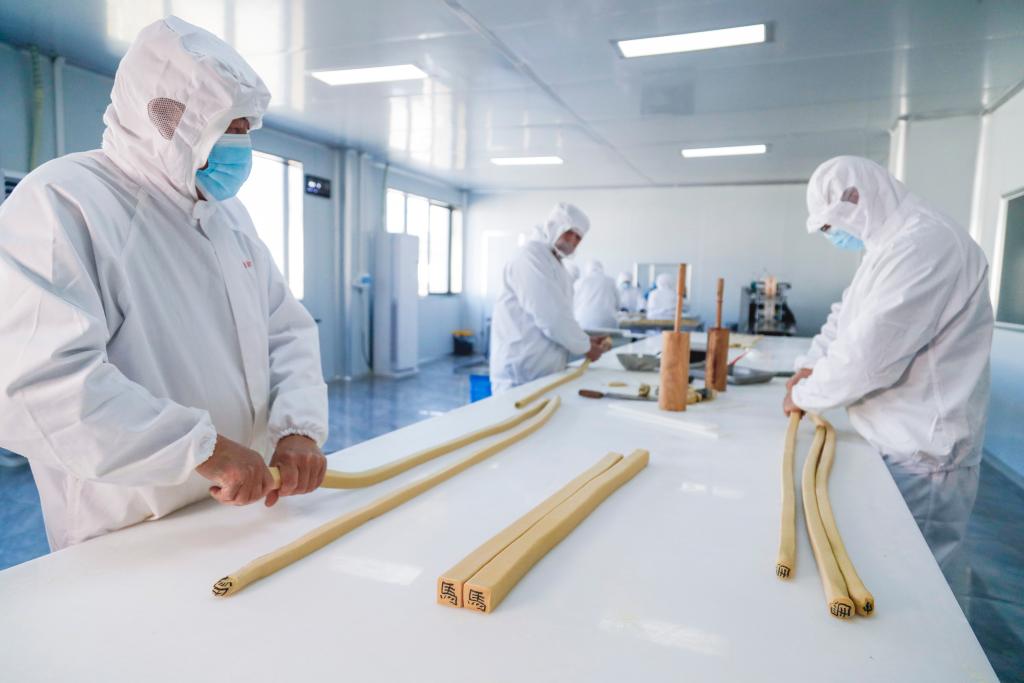 Staff members make character-inlaid candies in Qimen County of Huangshan City, east China's Anhui Province, Jan. 13, 2026. (Photo by Shi Yalei/Xinhua)