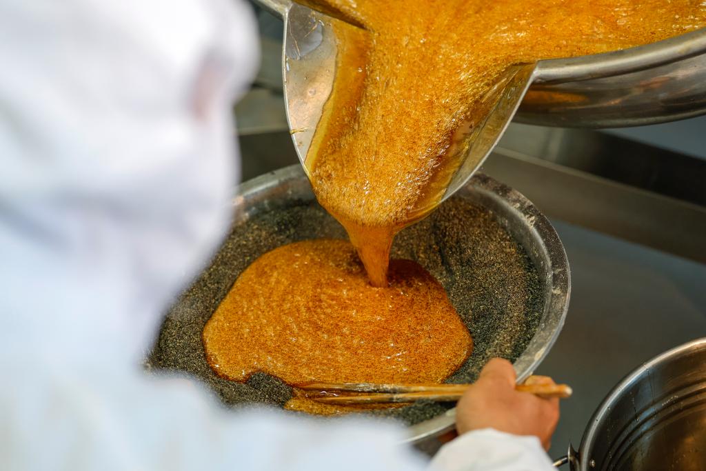 A character-inlaid candy maker makes sesame filling in Qimen County of Huangshan City, east China's Anhui Province, Jan. 13, 2026. (Photo by Shi Yalei/Xinhua)