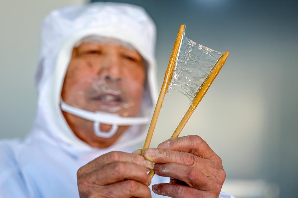 Jin Huimin, an inheritor of the making crafts of character-inlaid candy, observes syrup thickness in Qimen County of Huangshan City, east China's Anhui Province, Jan. 13, 2026. (Photo by Shi Yalei/Xinhua)