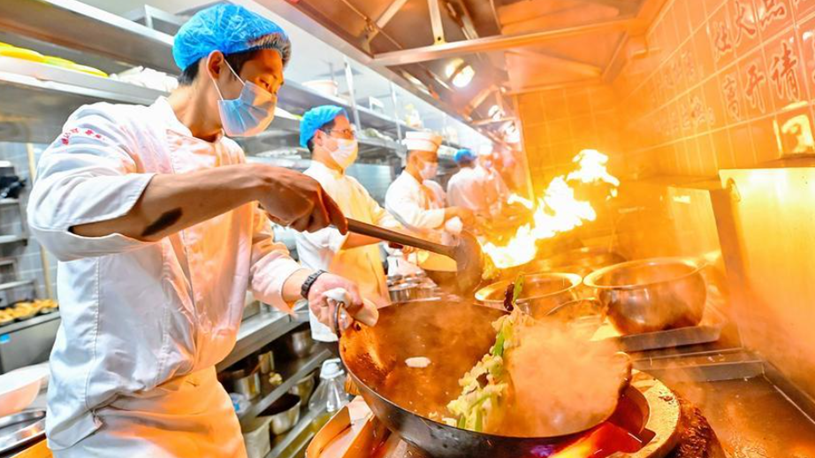 Chefs cook meals for customers at a restaurant in Binhai New Area of north China's Tianjin, Feb. 18, 2026. (Photo by Du Penghui/Xinhua)