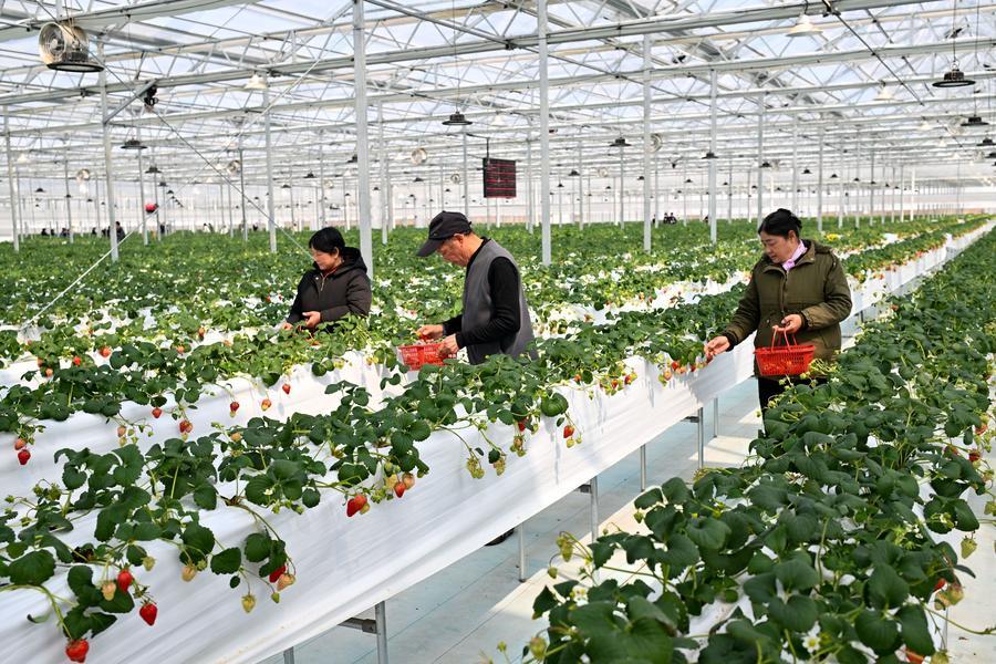 Staff members pick strawberries at a modern agricultural production base at Mudian Village, Xuyu County of east China's Jiangsu Province, March 8, 2025. (Photo by Yan Huaifeng/Xinhua)