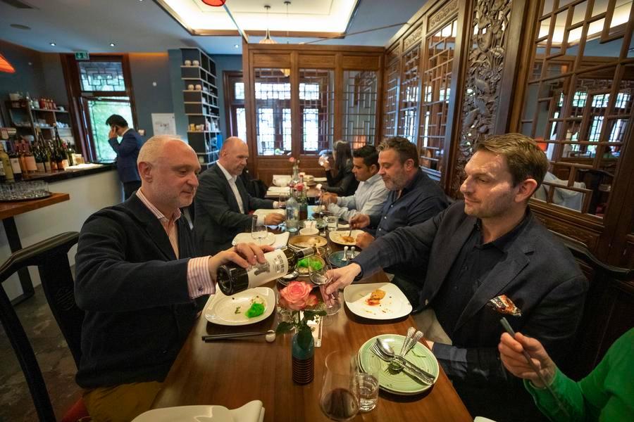 This photo taken on May 29, 2025 shows guests enjoying wine from northwest China's Ningxia Hui Autonomous Region at the Yu Garden Restaurant in Hamburg, Germany. (Xinhua/Zhang Fan)