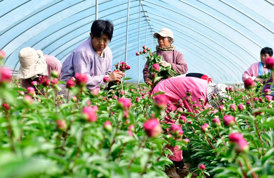 Farmers pick peony flowers at a fresh-cut flowers production base in Penglou Town, Heze City of east China's Shandong Province, April 10, 2025. (Xinhua/Guo Xulei)