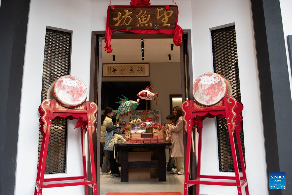 Tourists shop at a souvenir shop themed on fish-shaped lanterns in Zhanqi Village, Shexian County, Huangshan City of east China's Anhui Province, March 1, 2026. (Xinhua/Zhang Duan)