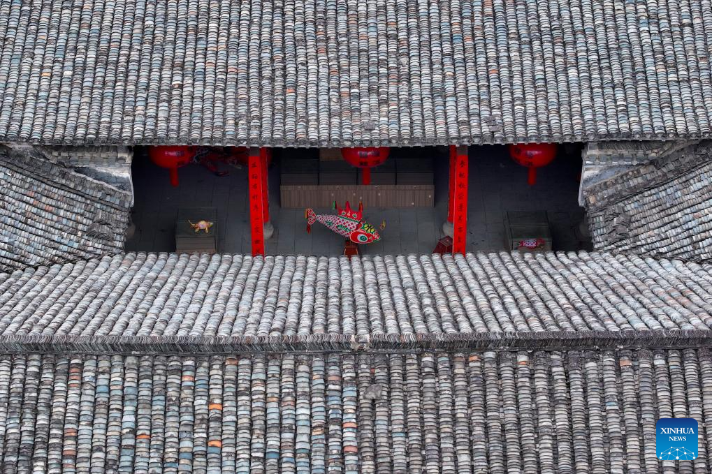 An aerial drone photo taken on Jan. 29, 2026 shows a fish-shaped lantern at an ancestral hall in Zhanqi Village, Shexian County of Huangshan City, east China's Anhui Province. (Photo by Fan Chengzhu/Xinhua)
