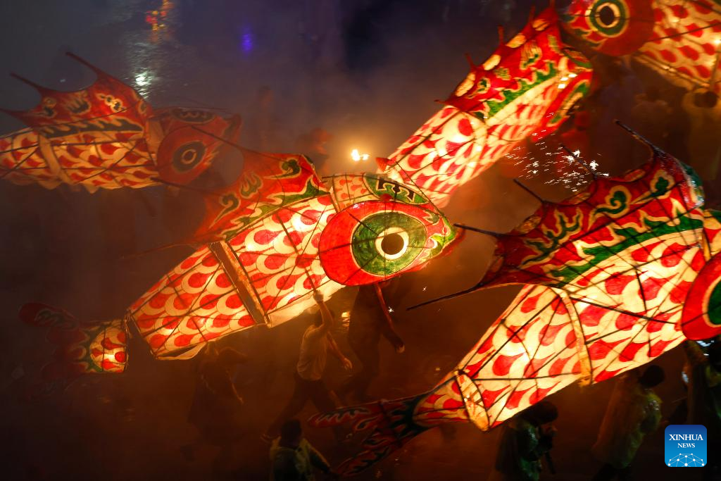 Performers holding fish-shaped lanterns perform in Shexian County, Huangshan City of east China's Anhui Province, Dec. 19, 2025. (Photo by Shi Yalei/Xinhua)