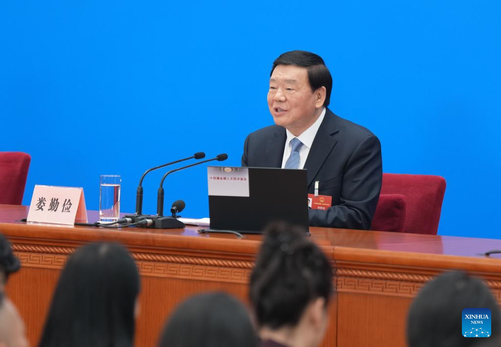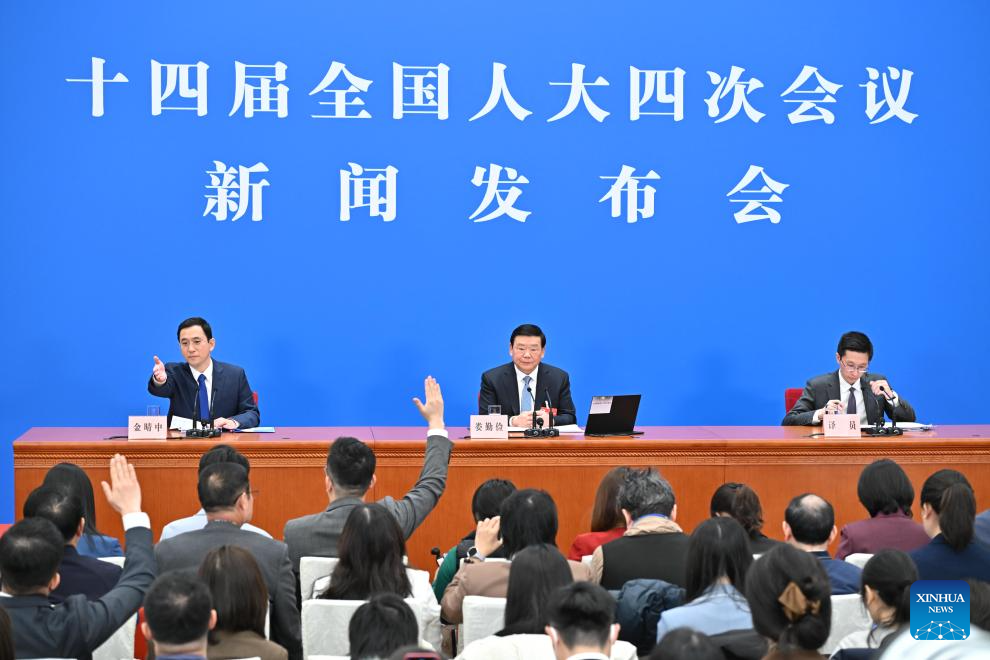 Lou Qinjian, spokesperson for the fourth session of the 14th National People's Congress (NPC), attends a press conference at the Great Hall of the People in Beijing, capital of China, March 4, 2026. The NPC, China's national legislature, held a press conference on Wednesday, one day ahead of the opening of its annual session. (Xinhua/Xing Guangli)