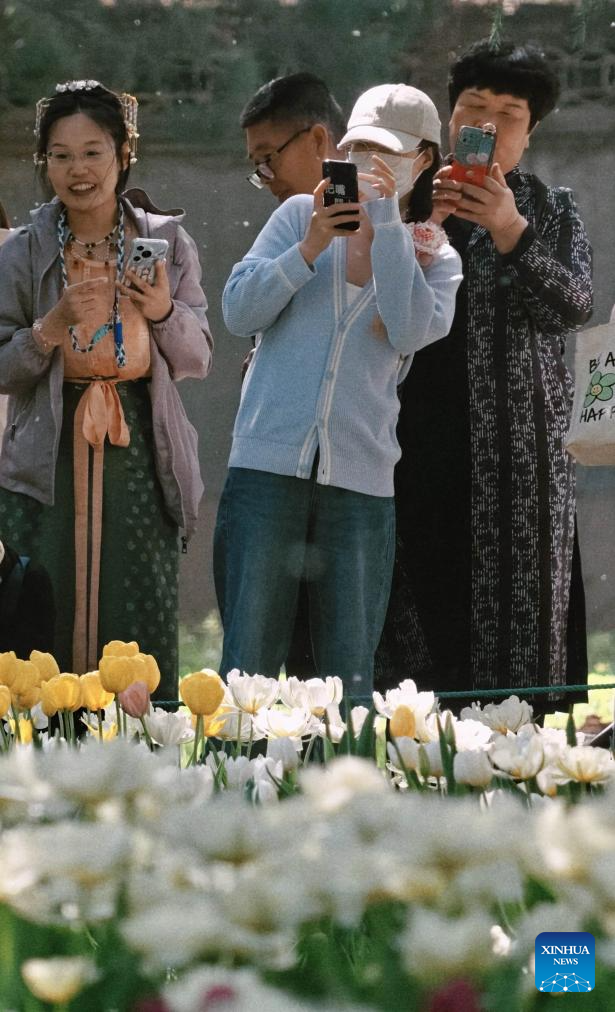 People take photos of tulip flowers at Zhongshan Park in Beijing, capital of China, April 10, 2026. (Xinhua/Xing Guangli)