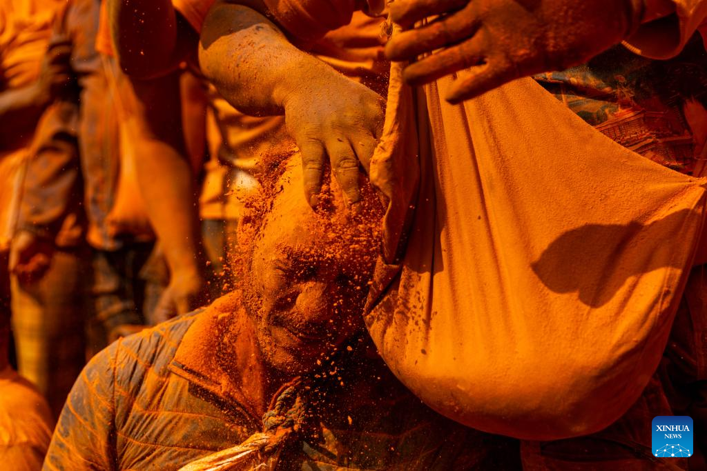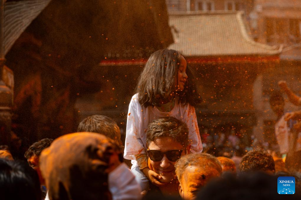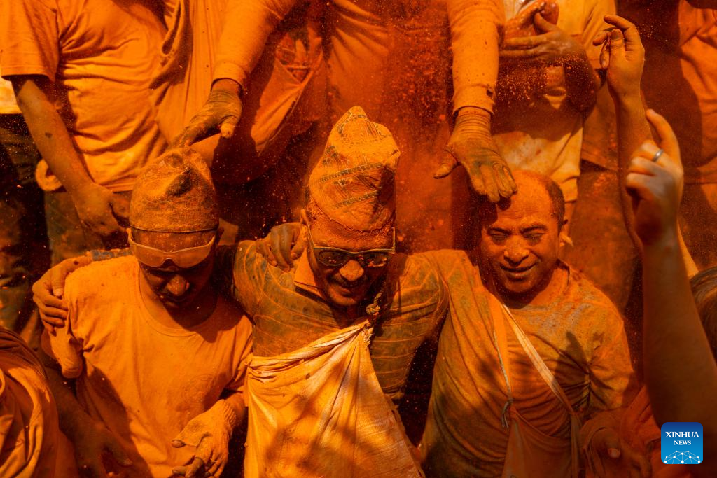 People celebrate the Sindoor Jatra festival in Bhaktapur, Nepal, April 15, 2026. The festival is celebrated to welcome the Nepalese New Year and the beginning of spring in Nepal. (Photo by Sulav Shrestha/Xinhua)