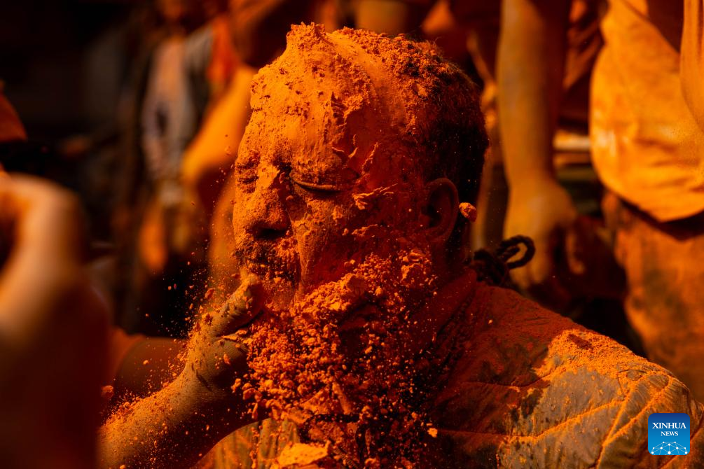 A man is smeared with vermilion powder during a celebration of the Sindoor Jatra festival in Bhaktapur, Nepal, April 15, 2026. The festival is celebrated to welcome the Nepalese New Year and the beginning of spring in Nepal. (Photo by Sulav Shrestha/Xinhua)