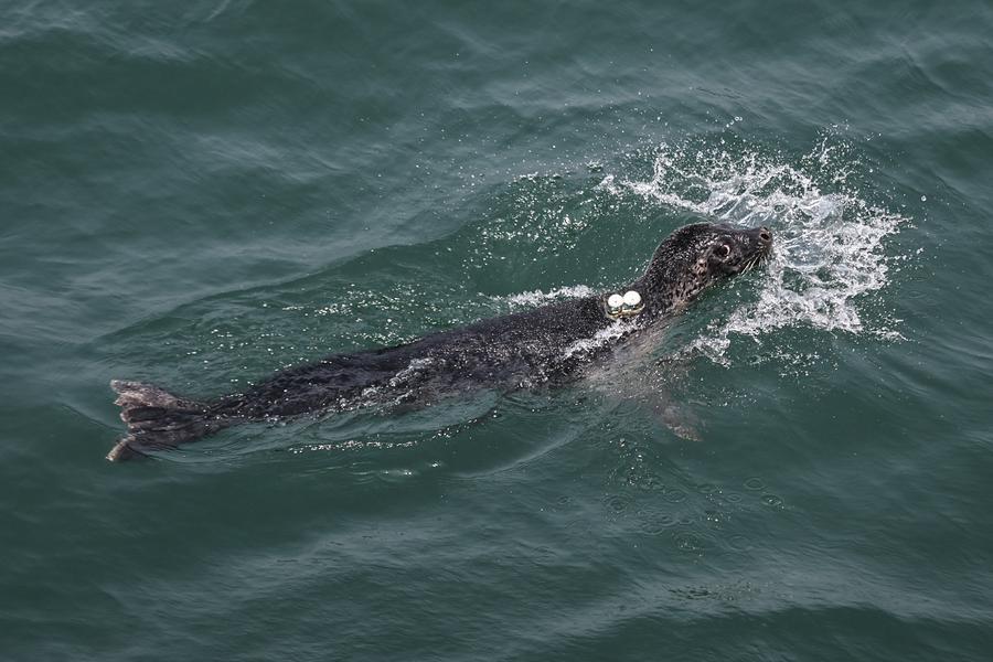 A newly released spotted seal swims in the waters off Dalian, northeast China's Liaoning Province, June 6, 2025. (Xinhua/Pan Yulong)
