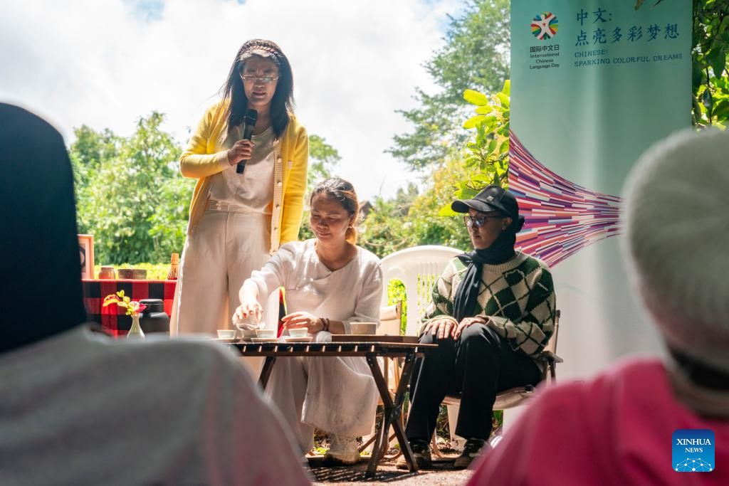 A teacher from the Confucius Institute at the University of Nairobi introduces tea art for students at a tea garden in Kiambu County, Kenya, April 15, 2026.