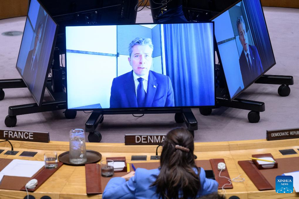 UN Under-Secretary-General for Humanitarian Affairs Tom Fletcher (on screens) speaks via a video link at a Security Council meeting at the UN headquarters in New York, April 17, 2026. (Loey Felipe/UN Photo/Handout via Xinhua)