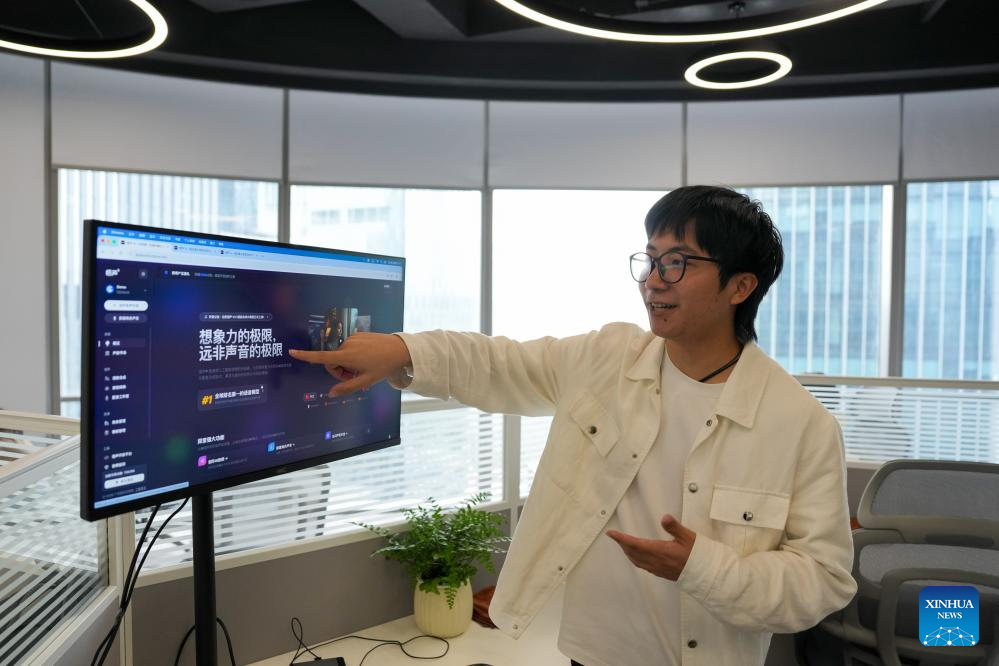 A founder of a tech company illustrates a language model developed by his company in Guangzhou, south China's Guangdong Province, March 26, 2026. (Xinhua/Wu Lu)