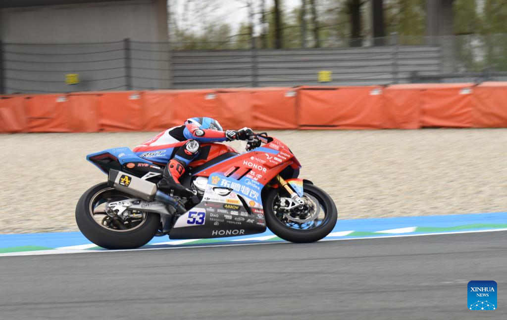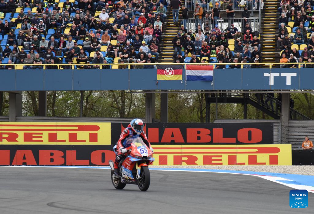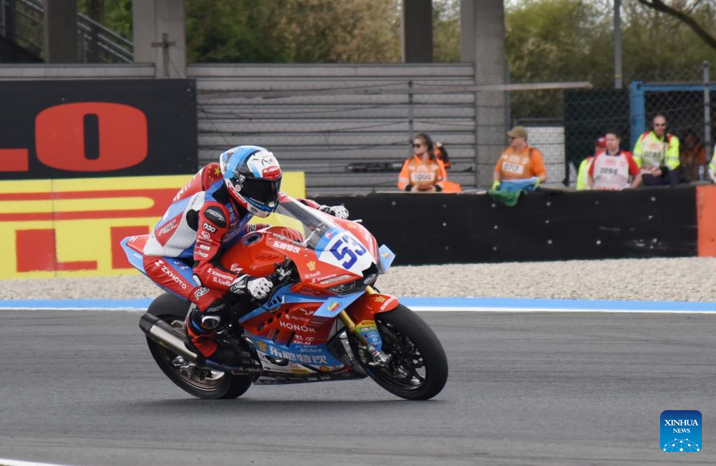 Valentin Debise of EASTROC ZXMOTO Evan Bros Factory competes during the race 1 of WorldSSP at the FIM Superbike World Championship in Assen, the Netherlands, April 18, 2026. (Xinhua/Shao Haijun)