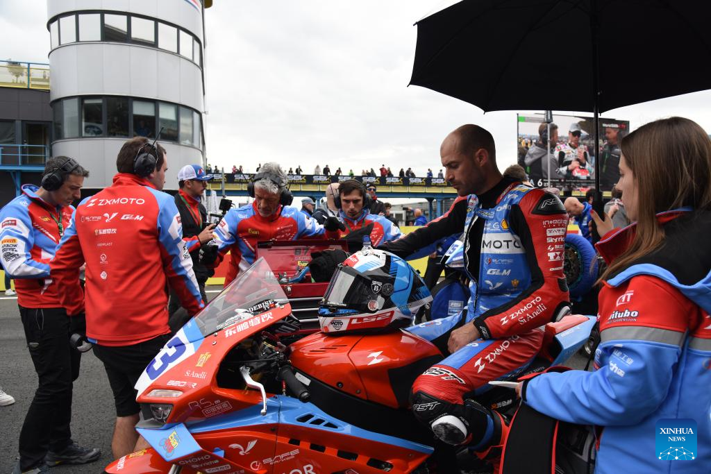 Valentin Debise of EASTROC ZXMOTO Evan Bros Factory prepares before the race 1 of WorldSSP at the FIM Superbike World Championship in Assen, the Netherlands, April 18, 2026. (Xinhua/Shao Haijun)