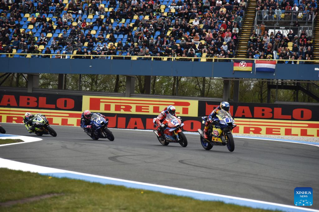 Valentin Debise (2nd R) of EASTROC ZXMOTO Evan Bros Factory competes during the race 1 of WorldSSP at the FIM Superbike World Championship in Assen, the Netherlands, April 18, 2026. (Xinhua/Shao Haijun)