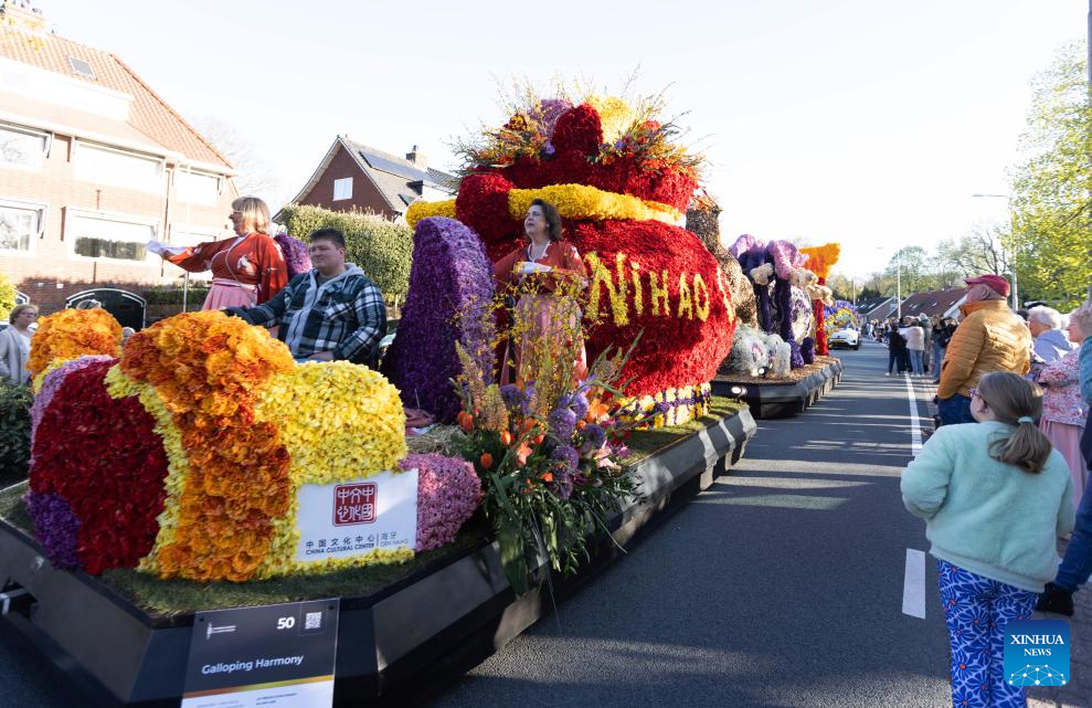 People watch a float during the Flower Parade of the Bollenstreek in Bennebroek, the Netherlands, April 18, 2026. (Photo by Sylvia Lederer/Xinhua)
