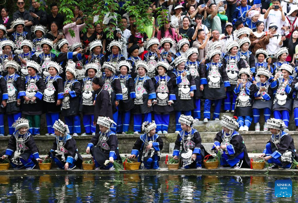 People of the Dong ethnic group participate in an event celebrating the Sanyuesan Festival at Zhenyuan County in southwest China's Guizhou Province, April 19, 2026. The Sanyuesan Festival is a traditional festival celebrated on the third day of the third lunar month by various ethnic groups in China. The festival falls on April 19 this year. (Xinhua/Yang Wenbin)