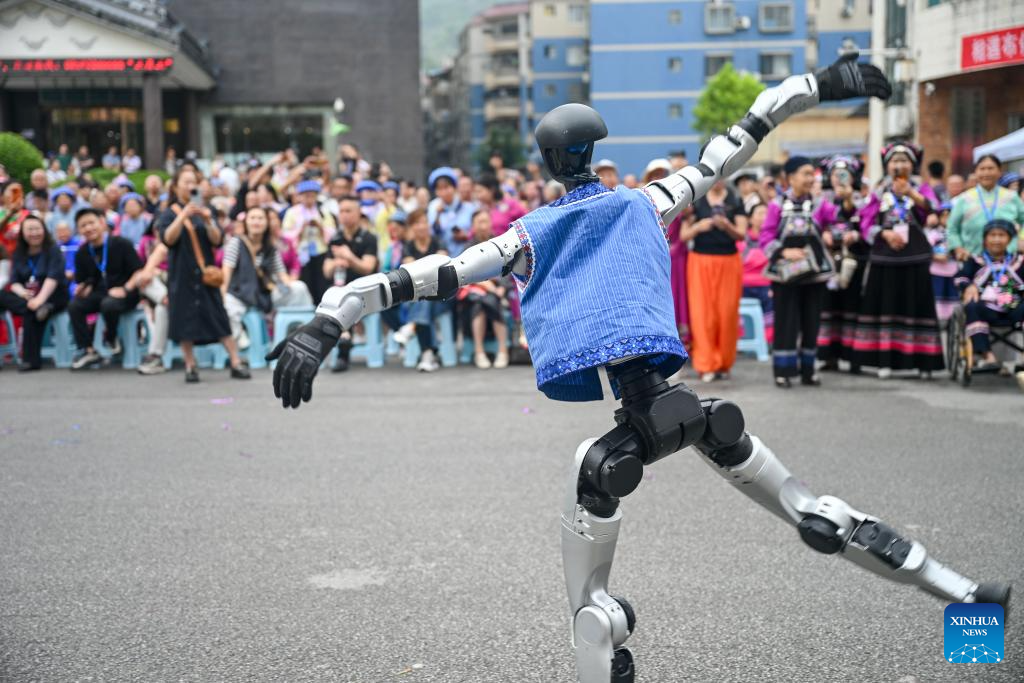 A robot performs in an event celebrating the Sanyuesan Festival in Wangmo County, Qianxinan Bouyei-Miao Autonomous Prefecture, southwest China's Guizhou Province, April 19, 2026. The Sanyuesan Festival is a traditional festival celebrated on the third day of the third lunar month by various ethnic groups in China. The festival falls on April 19 this year. (Photo by Yuan Fuhong/Xinhua)