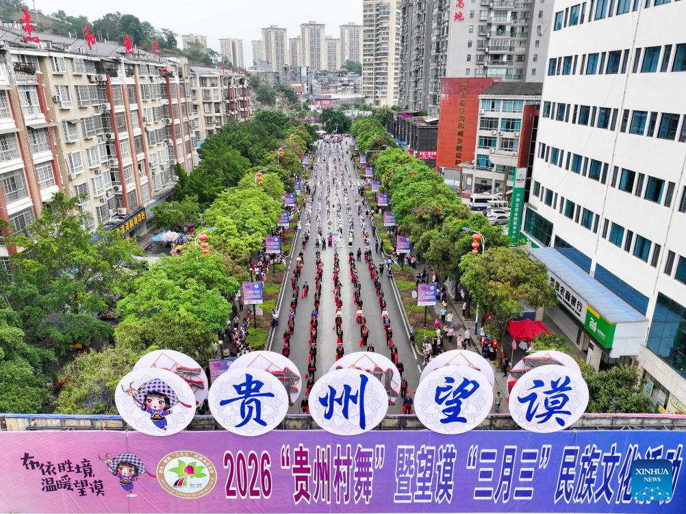 Performers dance in an event celebrating the Sanyuesan Festival in Wangmo County, Qianxinan Bouyei-Miao Autonomous Prefecture, southwest China's Guizhou Province, April 19, 2026. The Sanyuesan Festival is a traditional festival celebrated on the third day of the third lunar month by various ethnic groups in China. The festival falls on April 19 this year. (Photo by Yuan Fuhong/Xinhua)