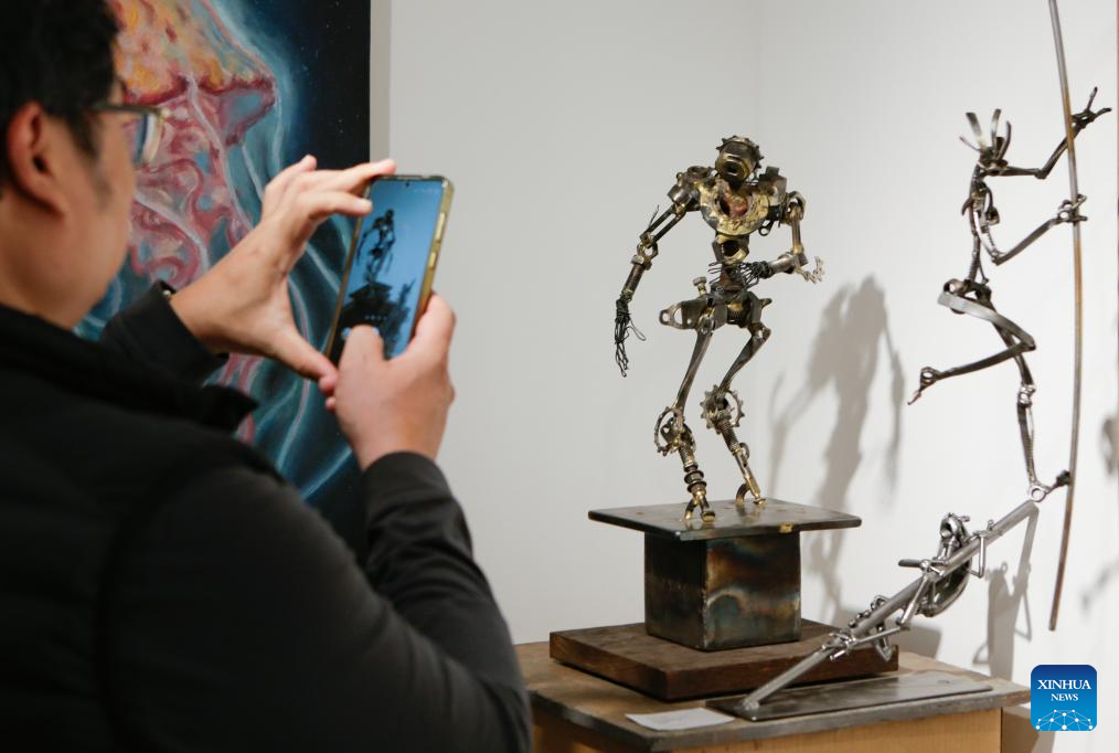 A visitor takes photos of exhibits made from recycled materials at the "Art Against Climate Disaster" exhibition in Burnaby, Canada, April 18, 2026. The exhibition runs from April 16 to 25, featuring works from 19 artists using recycled materials in sculpture, painting and collage to highlight environmental challenges. (Photo by Liang Sen/Xinhua)
