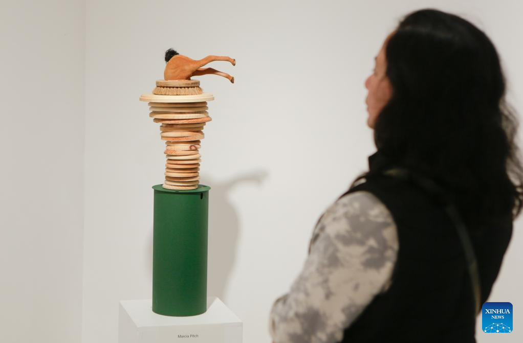 A visitor views an exhibit made from recycled materials at the "Art Against Climate Disaster" exhibition in Burnaby, Canada, April 18, 2026. The exhibition runs from April 16 to 25, featuring works from 19 artists using recycled materials in sculpture, painting and collage to highlight environmental challenges. (Photo by Liang Sen/Xinhua)