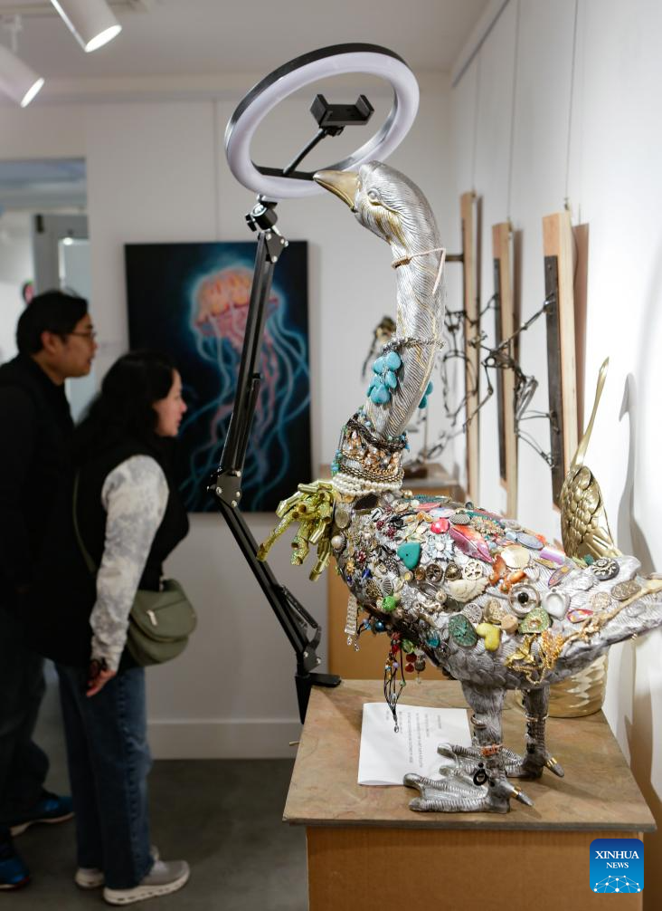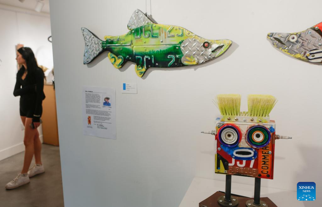 A visitor views artworks made from recycled materials at the "Art Against Climate Disaster" exhibition in Burnaby, Canada, April 18, 2026. The exhibition runs from April 16 to 25, featuring works from 19 artists using recycled materials in sculpture, painting and collage to highlight environmental challenges. (Photo by Liang Sen/Xinhua)