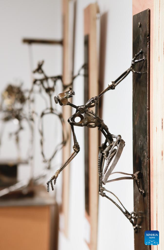 An exhibit made from recycled materials is on display at the "Art Against Climate Disaster" exhibition in Burnaby, Canada, April 18, 2026. The exhibition runs from April 16 to 25, featuring works from 19 artists using recycled materials in sculpture, painting and collage to highlight environmental challenges. (Photo by Liang Sen/Xinhua)