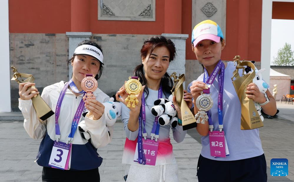 Gold medalist Wang Qiaoxia (C), silver medalist Yang Xiaoli (R) and bronze medalist Zhang Xiaomin display the medals and trophies after the awarding ceremony for the women's half-marathon at the Beijing E-Town half-marathon and humanoid robots half-marathon in the Beijing Economic-Technological Development Area in southeast Beijing, China, April 19, 2026. (Xinhua/Wang Lili)