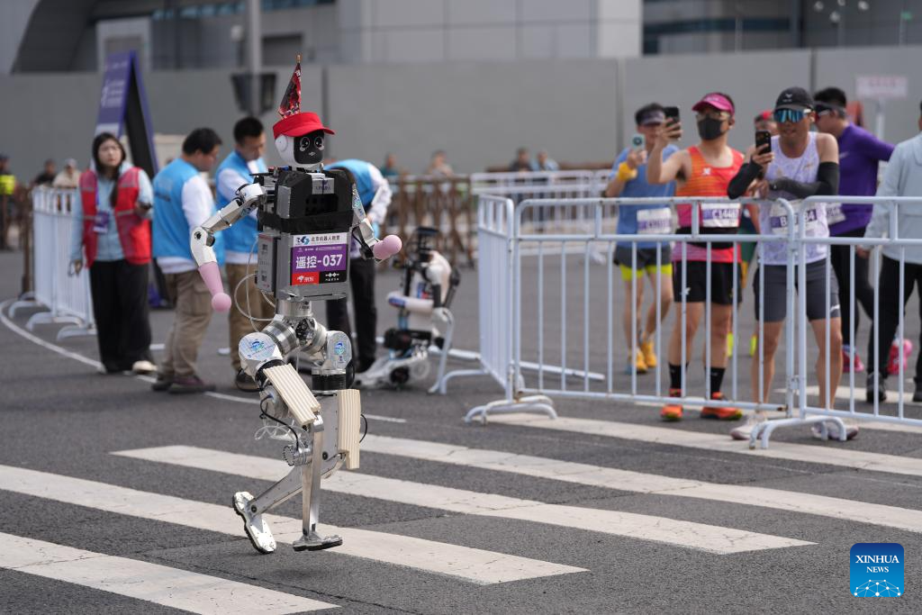 Humanoid robot "Flash" of Jueyingchitu Team in the remote-controlled category crosses the finish line during the Beijing E-Town half-marathon and humanoid robots half-marathon in the Beijing Economic-Technological Development Area in southeast Beijing, China, April 19, 2026. (Xinhua/Zhang Chenlin)